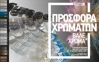Νέα προσφορά χρωμάτων EUROPA NEA μεγάλη προσφορά χρωμάτων στα αρχιτεκτονικά συστήματα αλουμινίου EUROPA, με ισχύ από 1/1/2020 έως και 30/6/2020! 8 δημοφιλή χρώματα στην τιμή του λευκού και 12 σε πολύ ειδικές τιμές! Η προσφορά ισχύει για Αλουμίνια, Σίτες ή